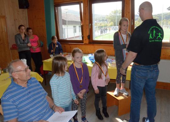 Nach den Wettkämpfen zogen alle in das Heim des TVE um, wo sie sich bei Würstchen und von den Eltern gespendeten Salaten stärken konnten. Danach überreichte der 1. Vorsitzende des Turnvereins, Ulrich Roth, den Siegern die Medaillen.