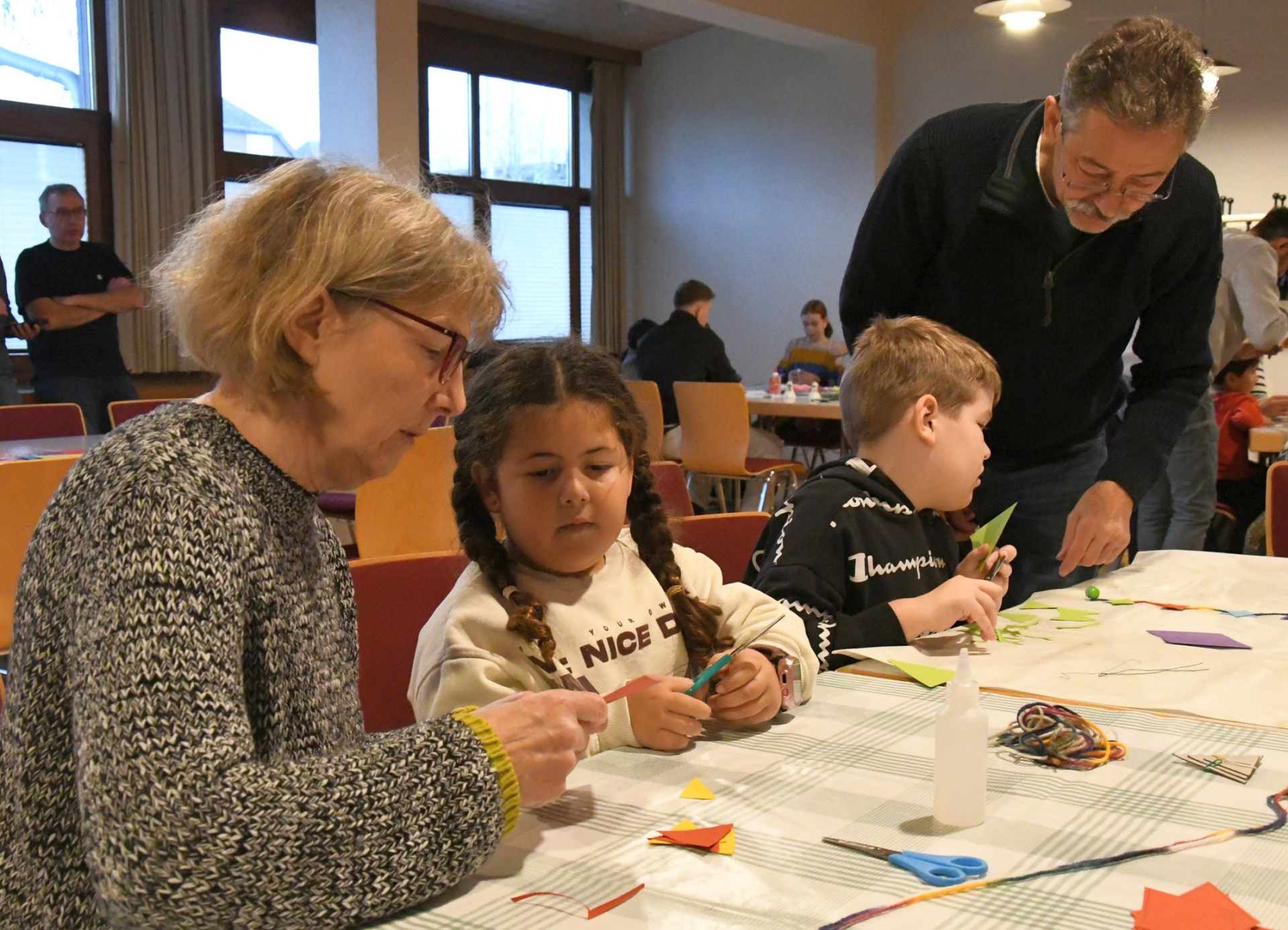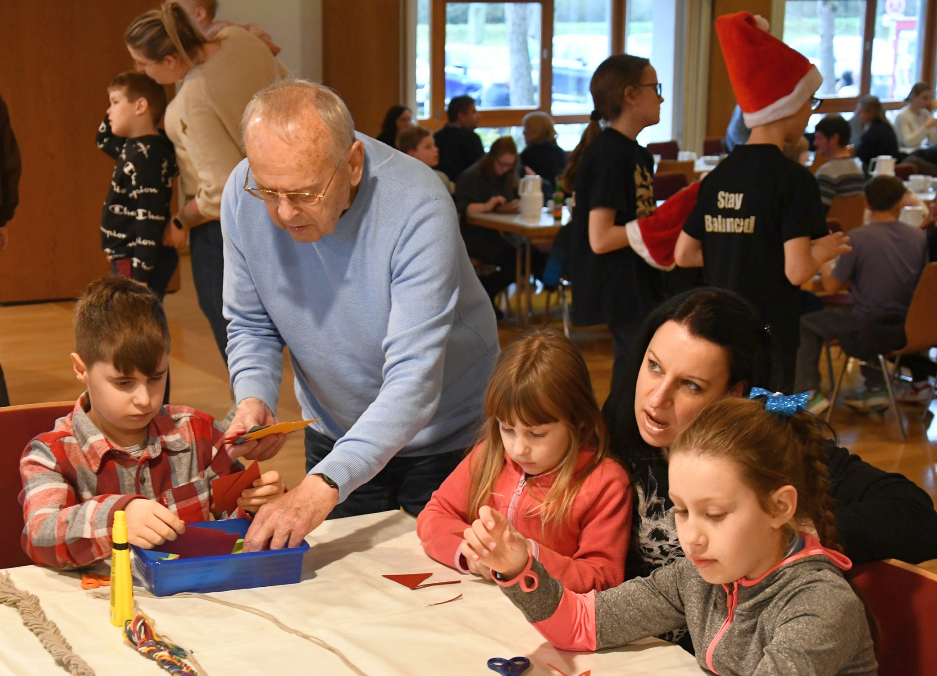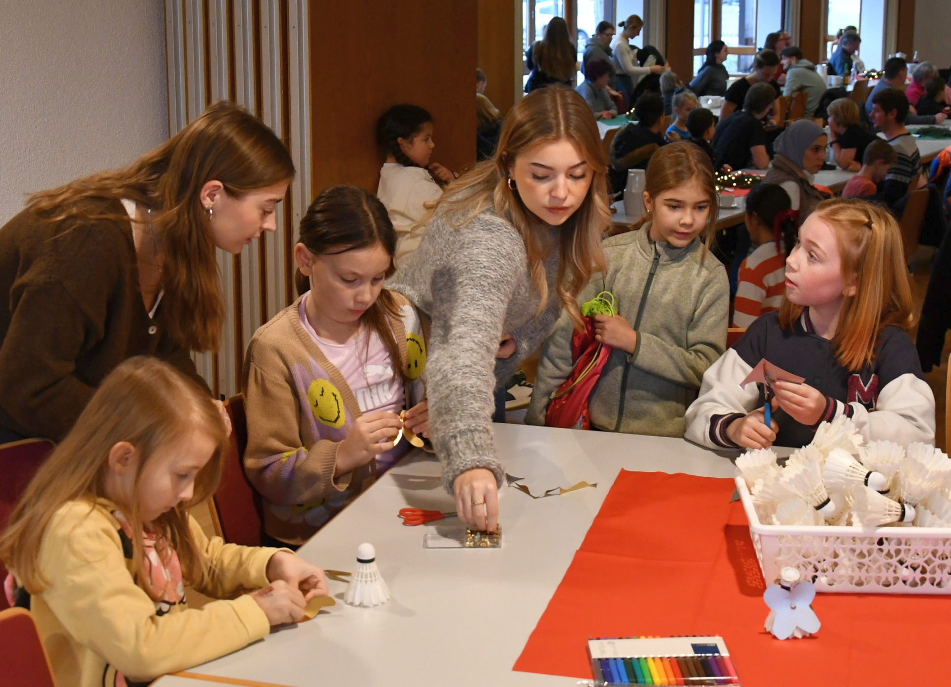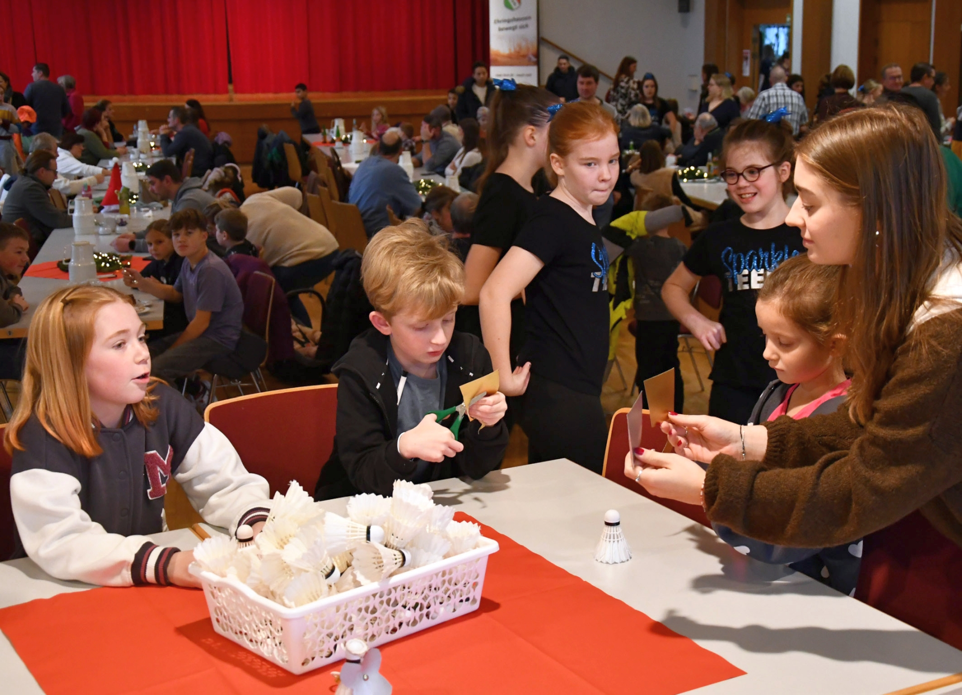 Mit einem gemeinsamen Kaffeetrinken begannen die Turner die Weihnachtsfeier. Eine reichhaltige Kuchentafel und frisch gekochter Kaffee sorgten für einen willkommenen Einstand. In der Zeit, während sich Mama und Papa sowie Oma und Opa die süßen Leckereien schmecken ließen, konnten die kleinen Besucher an verschiedenen Bastelaktionen ihr Fingergeschick auf die Probe stellen. In mühevoller Kleinarbeit und der einen oder anderen Hilfe der Betreuer entstanden bunte Sternenketten und tolle Engelsfiguren aus Federbällen, wofür sich die Vereinsabteilungen „Mehr Bewegung in den Kindergarten“ und „Badminton“ verantwortlich zeigten.
